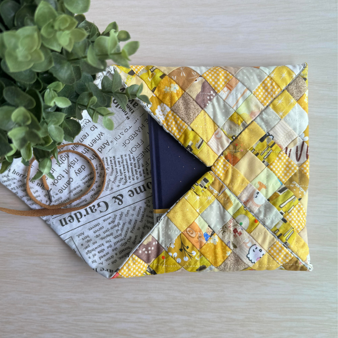The Tsutsumi Patchwork Envelope uses a simple idea of a fabric envelope with a shoelace as fastener for easy closure. You can use this to hold a physical book or an e-reader or stationery, etc. Inside each envelope is a mystery note (with a random message) that is hand embroidered by me - I call it a SASSY (SC ANYHOW SEWS and STITCHES for YOU) note : )